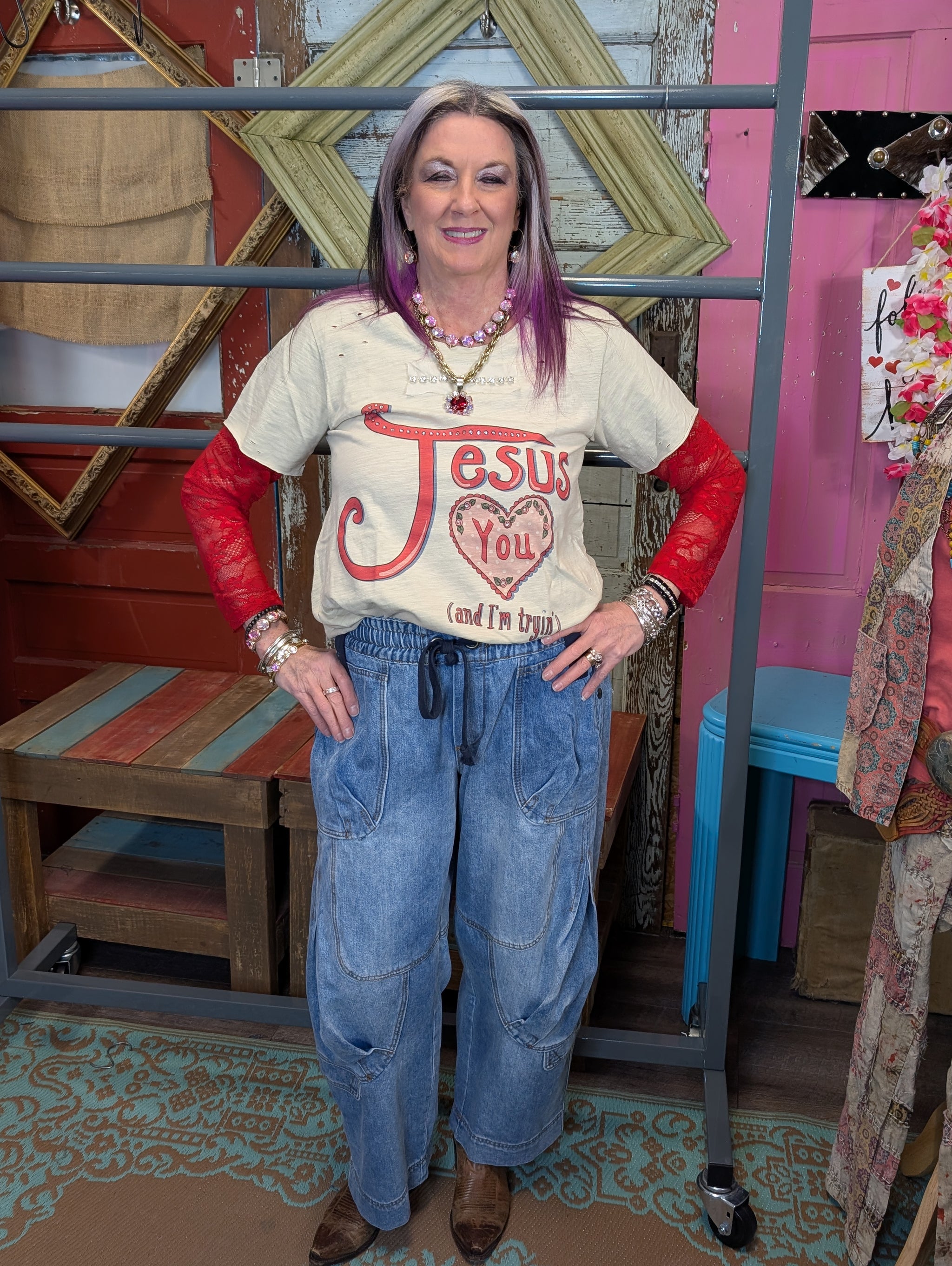 Embrace your inner spiritual rebel with this playful graphic tee from A Rare Bird. Featuring a bold, tongue-in-cheek "Jesus I tired" message, it's the perfect piece for those days when you need to wear your mood on your sleeve. Crafted for comfort and style, this tee pairs effortlessly with your favorite denim or bohemian layers. A conversation starter that celebrates authenticity and a little irreverent humor.