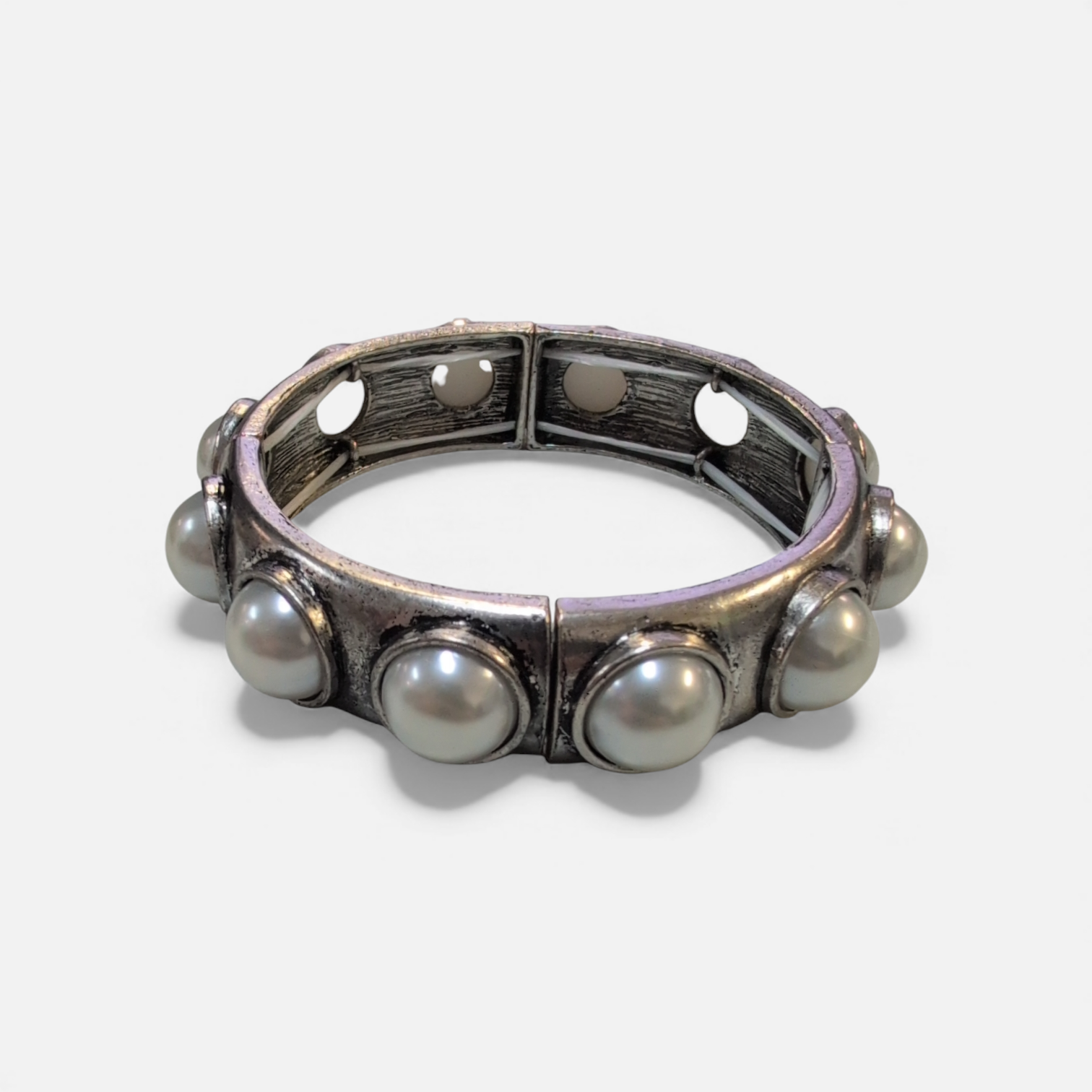Elegant silver stretch bracelet adorned with beautiful pearls. This versatile accessory effortlessly complements any outfit, from casual to dressy. The comfortable stretch design ensures a perfect fit, while the lustrous pearls add a touch of timeless sophistication.