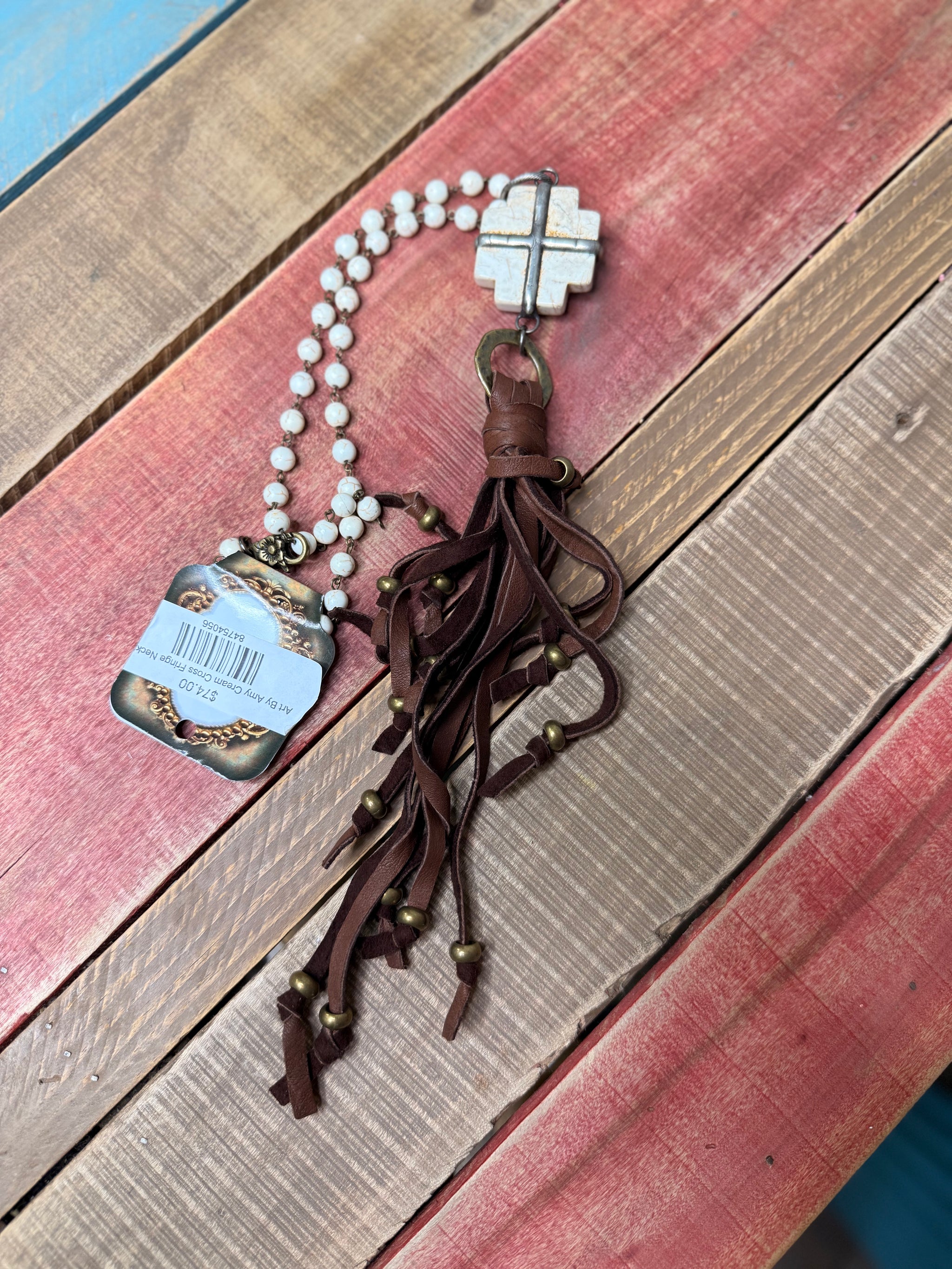 Add a playful yet elegant touch to your outfit with the Art By Amy Cream Cross Fringe Necklace. Featuring a cream-colored cross pendant accented with delicate fringe details, this necklace effortlessly blends style and personality. Perfect for layering or wearing solo, it’s a versatile accessory that adds a fun, meaningful flair to any look. Crafted with care, it’s sure to become a standout piece in your jewelry collection.