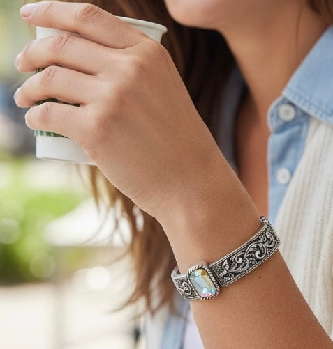 Rock your signature style with this dazzling floral swirl stretch bracelet, available in your choice of silver or gold. Four substantial real crystals add serious sparkle and dimension, catching light with every gesture. The stretchy design hugs your wrist comfortably without any clasps or adjustments needed. Perfect for layering or wearing solo, this chic accessory brings that perfect balance of playful elegance to elevate any outfit.
