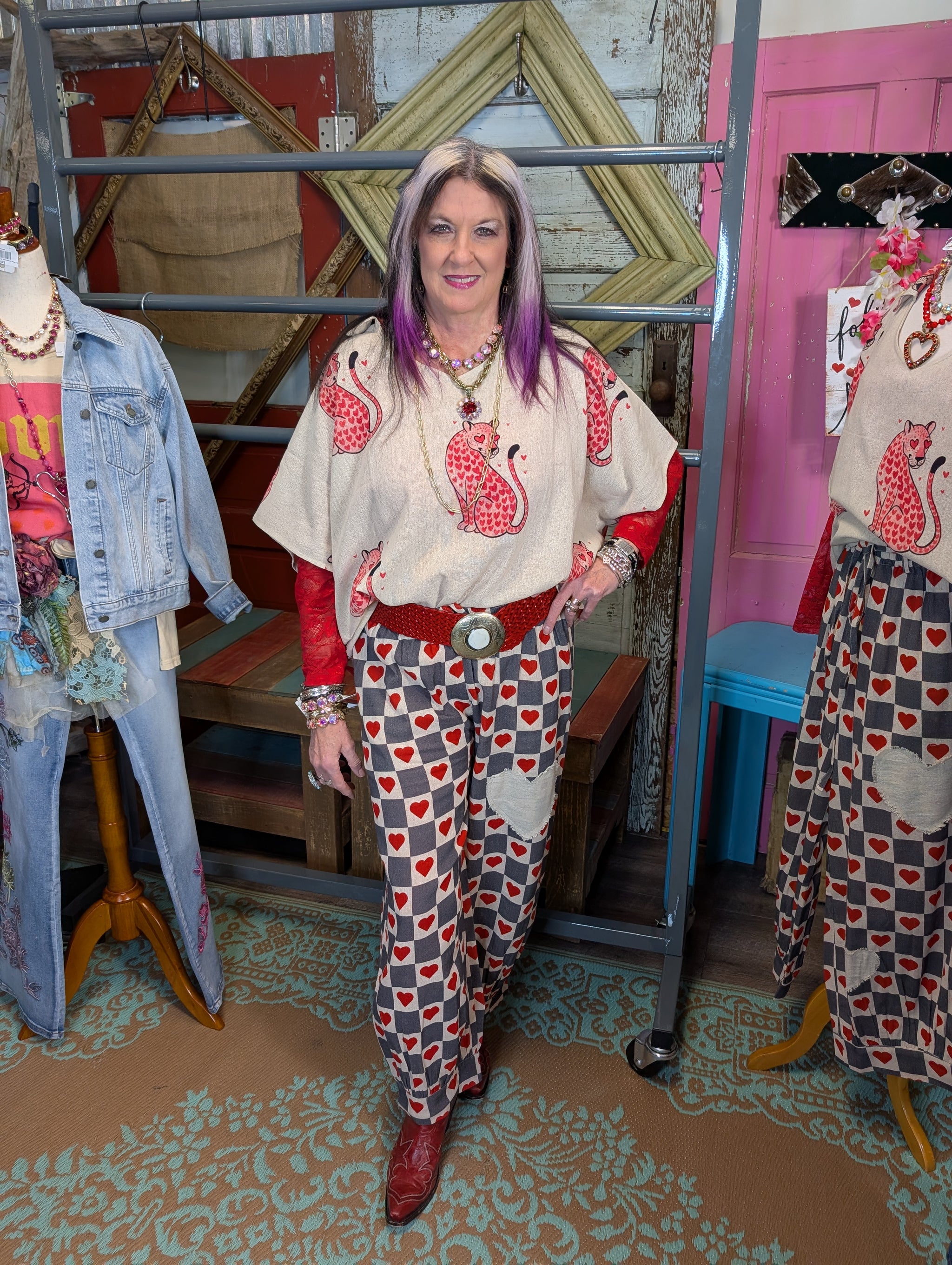 Add a playful touch to your wardrobe with these I Love Linen heart checkered pants. Crafted from premium Italian linen, these unique pants feature charming heart motifs combined with classic checkered patterns. Made in Italy with exceptional artisanal craftsmanship, these pants bring comfort, style, and bohemian elegance to any outfit.