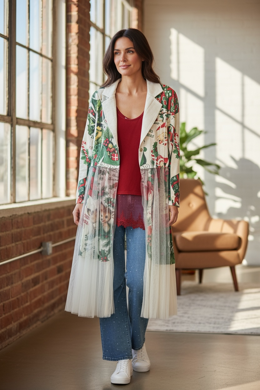 Embrace holiday cheer with this charming vintage-inspired Christmas blazer featuring whimsical origami artwork. Perfect for festive gatherings, this playful piece combines classic tailoring with unique seasonal flair. The intricate design brings a touch of artistic sophistication to your holiday wardrobe, making it an instant conversation starter. Whether you're heading to a party or casual celebration, this blazer adds personality and warmth to any outfit. Celebrate the season in style with this delightfully different take on festive fashion.