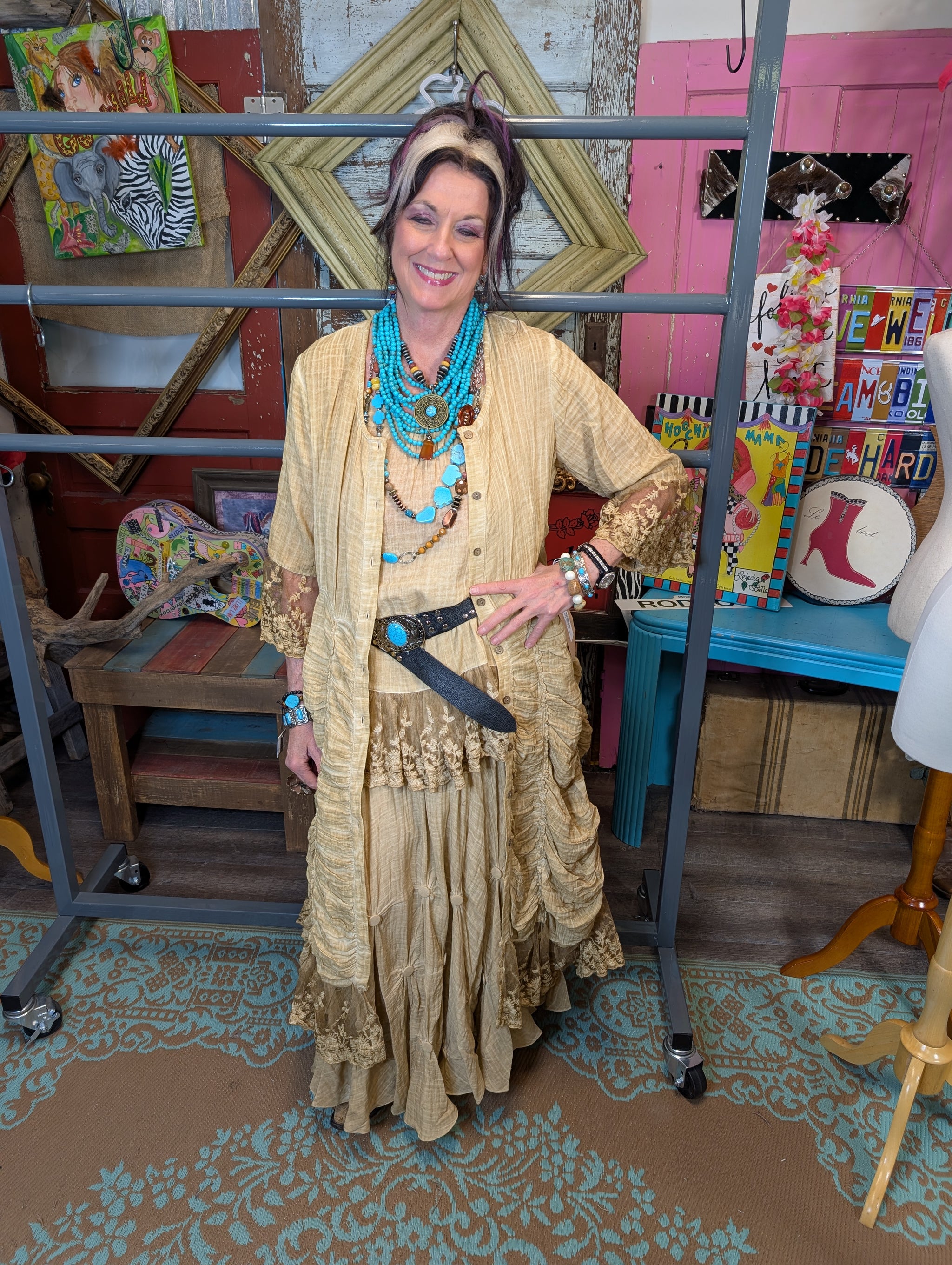 Delicate paper lace meets romantic Victorian silhouette in this statement piece. Intricate rusching details create dimensional texture throughout, while the lace overlay adds an ethereal, vintage-inspired quality. Perfect for those who embrace bohemian elegance with a touch of timeless femininity. A versatile layer for special occasions or elevated everyday wear.