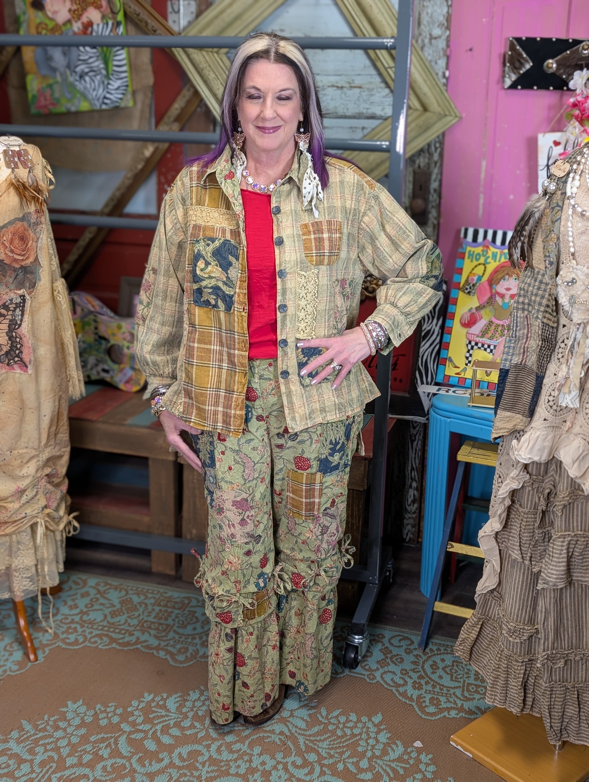 Discover the artistry of handcrafted fashion with these one-of-a-kind reversible pants from A Rare Bird Collection. Each pair tells its own story through carefully curated vintage-inspired patchwork—featuring soft plaid stripes on one side and a delicate floral garden on the reverse.