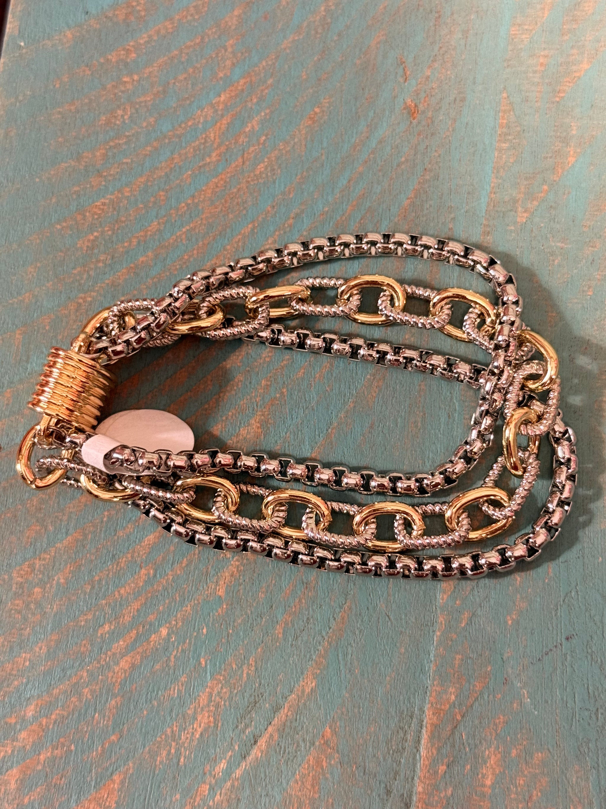 Elevate your style with this Silver Gold Multi Chain Bracelet, expertly crafted to blend the shine of silver and gold in a playful, layered look. Perfect for mixing and matching, it adds a dynamic touch to any outfit, whether casual or dressy. Wear it solo for subtle sparkle or stack it for a bold statement—this versatile piece keeps your accessory game fresh and effortlessly chic.