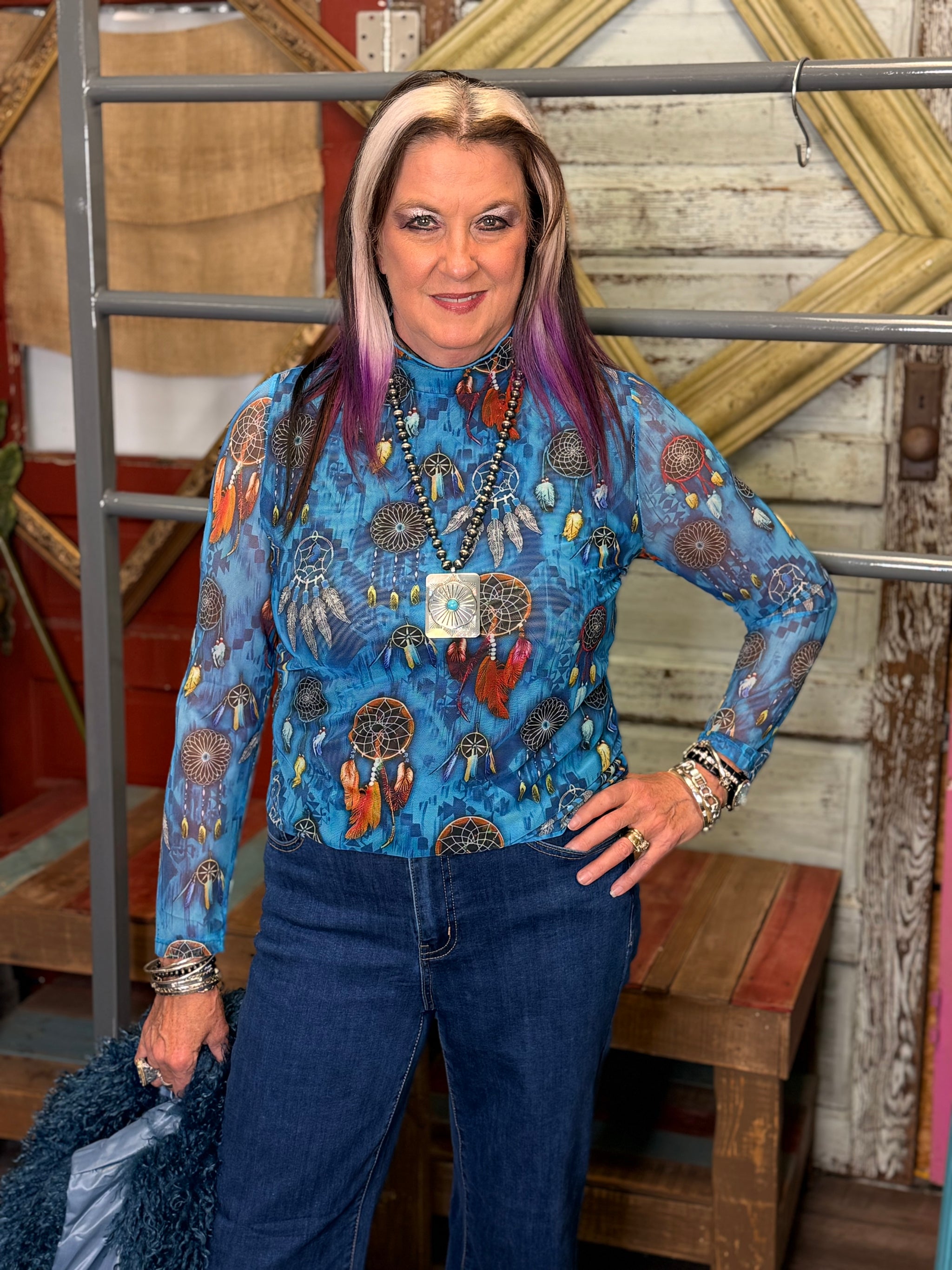 This sheer shirt features a vibrant dream catcher print that adds a whimsical touch to your outfit. Lightweight and breathable, it’s perfect for layering or wearing on its own to showcase your fun, free-spirited style. Designed for comfort and flair, this piece brings a dreamy vibe to your everyday wardrobe.