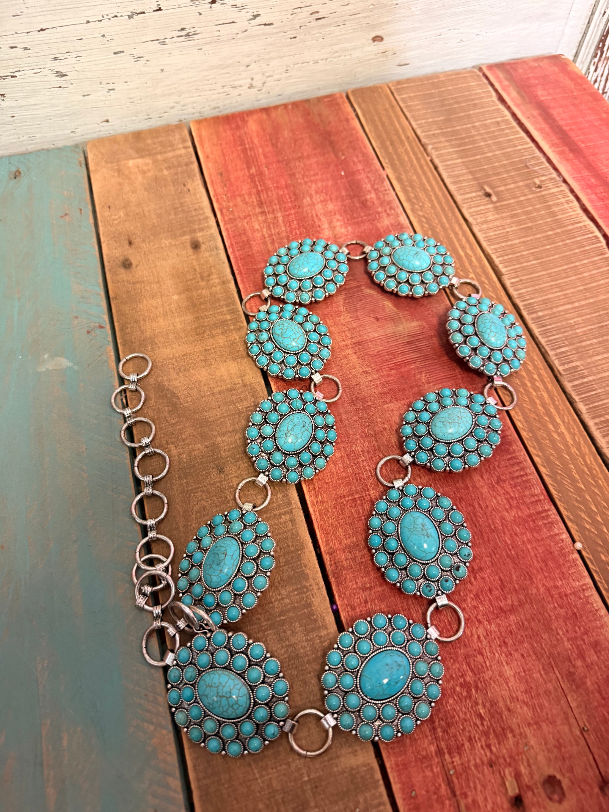 Add a vibrant touch of Southwest charm with this turquoise Squash Blossom Concho belt. Featuring bold turquoise stones set in classic silver conchos, this belt effortlessly combines traditional Navajo-inspired design with contemporary flair. Perfect for accentuating jeans or dresses, it adds a playful yet expert-crafted statement to any outfit. Durable and stylish, itβs ideal for those who appreciate authentic, handcrafted accessories with a fun twist.